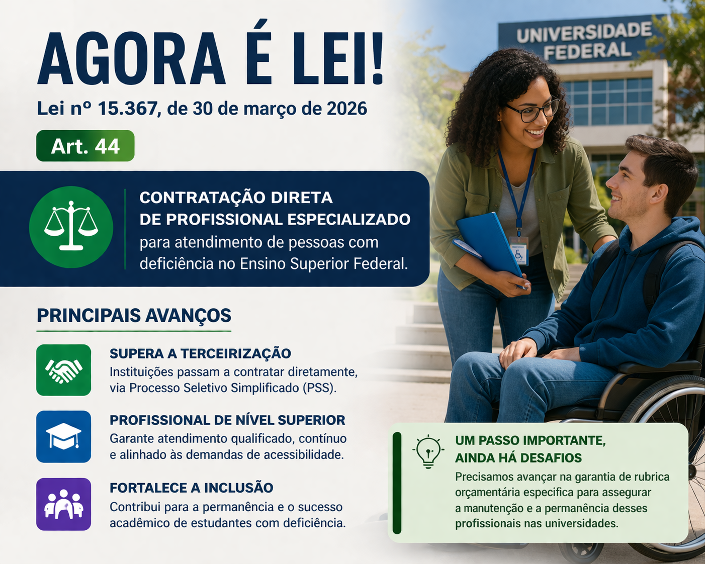 DESCRIÇÃO DE IMAGEM: Arte informativa com fundo claro e elementos em azul e verde anuncia a Lei nº 15.367, de 30 de março de 2026. No topo, o destaque “AGORA É LEI!” chama atenção para a nova legislação, com referência ao Art. 44. À esquerda, há ícones ilustrativos e textos que destacam os principais avanços: a substituição da terceirização pela contratação direta via Processo Seletivo Simplificado (PSS), a exigência de profissionais de nível superior e o fortalecimento da inclusão no ensino superior. À direita, uma cena em ambiente universitário mostra uma profissional com crachá conversando com um estudante em cadeira de rodas, simbolizando o atendimento especializado e a promoção da acessibilidade. Na parte inferior, há um destaque indicando que, embora seja um avanço importante, ainda existem desafios, especialmente quanto à garantia de orçamento específico para manutenção desses serviços.